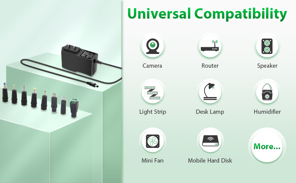The universal AC adapter is equipped with 8 DC plugs: 5.5x2.5mm (compatible with 5.5x2.1mm), 4.0x1.7mm, 3.5x1.35mm, 3.0x1.1mm, 2.5x0.7mm, Micro USB, Type-C terminal connectors, expanding the application range of the adapter. Please confirm the size of the DC jack again before purchasing to ensure compatibility.
