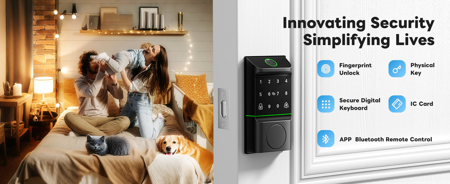 Multiple unlocking options: Easily unlock this door lock through fingerprint, PIN, IC card, physical key, or one click Bluetooth application control.