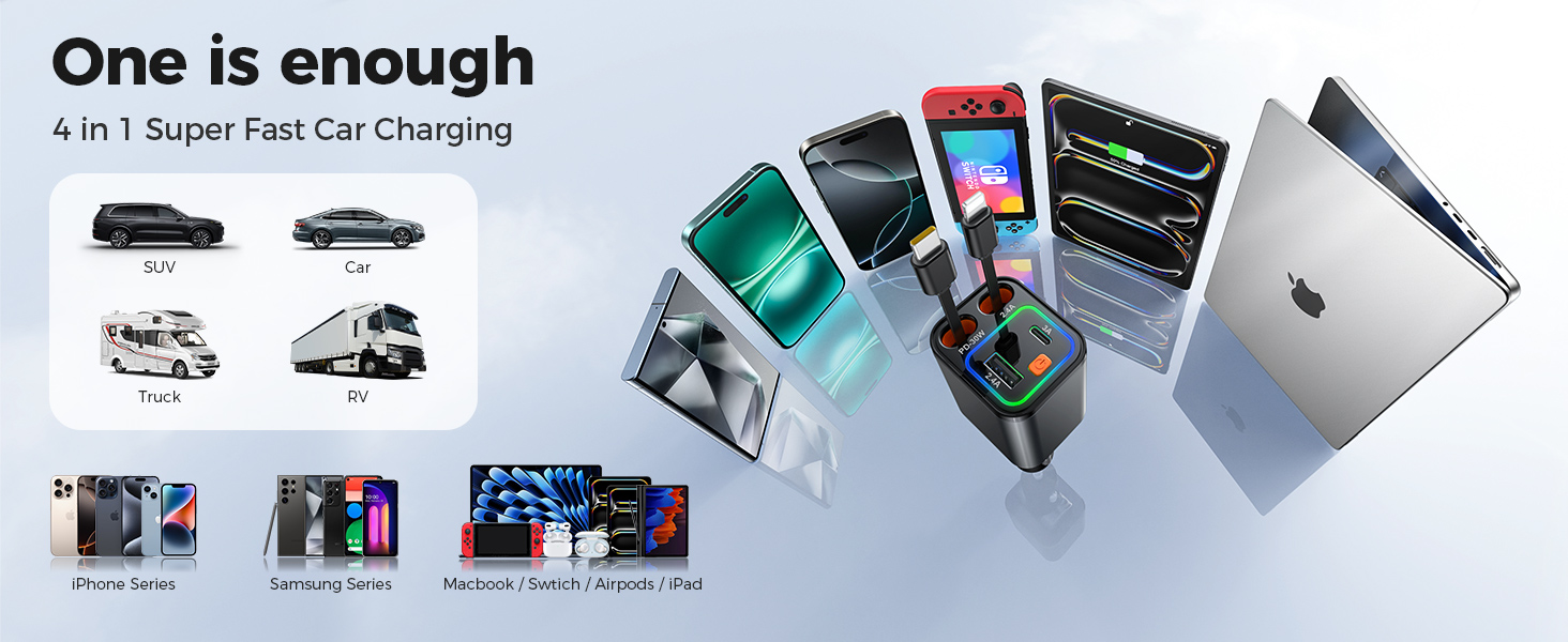 Multi port car charger: The multi device charging mode of this 84W 4 in 1 car cigarette lighter can meet the diverse charging needs of users during their journey. The built-in C-type and L-type telescopic charging cables can meet the charging needs of almost all smart devices. The PD port supports fast charging and can charge the iPhone 16 to 50% in half an hour, allowing you to say goodbye to battery worries; The QC port, when paired with other charging cables, can meet the charging needs of other small devices during travel, perfectly solving the charging problem during the journey and making your trip more enjoyable
