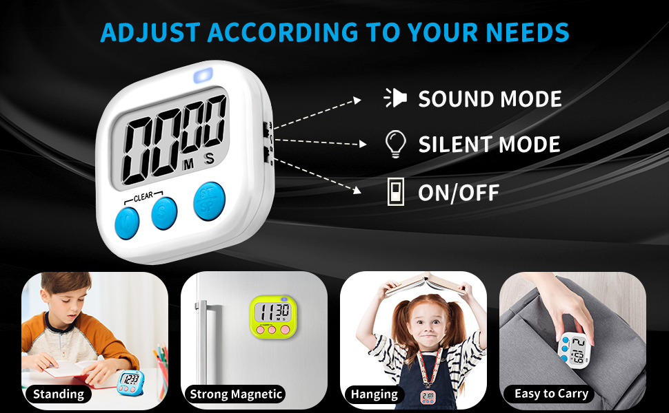 • Cooking timer with Strong Magnetic back 2.0 retractable stand and hook for hanging, can be positioned in variety of locations, like table, refrigerator, dry erase board and wall hooks