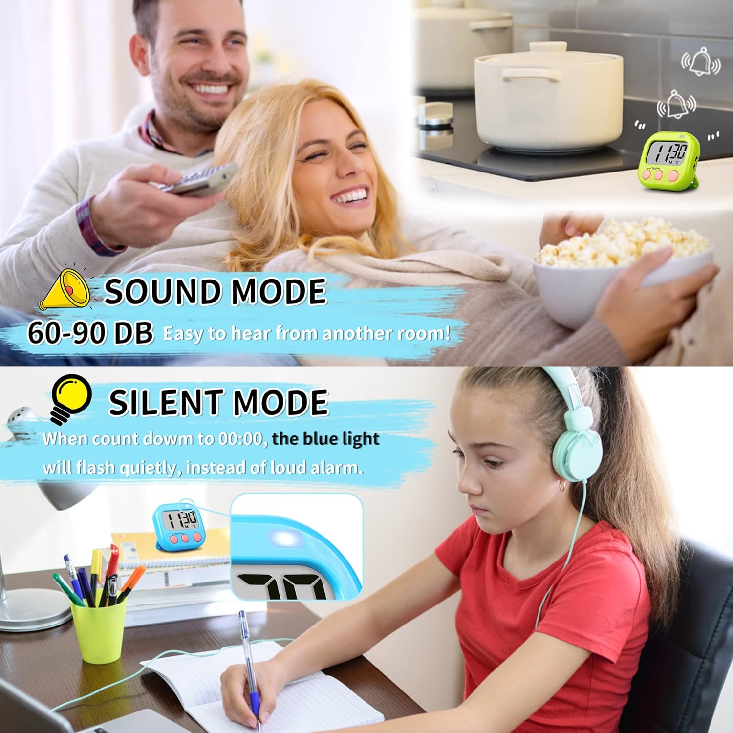 • Clear and Loud alarm, you will easily be able to hear this alarm in another room, and you could switch "alarm"/"silent" mode to allow for use in quiet environments with the 'Mute' setting like classroom, library.